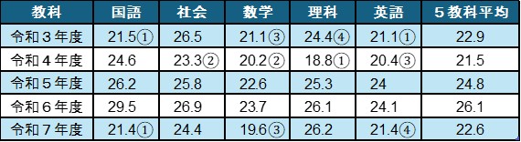 表から分かる通り、広島県の入試問題は長年にわたり全国でも“低得点常連”と言われてきました。特に令和4年以前は、ほぼすべての教科が全国の低得点ランキングに入るほどの難しさでした。
