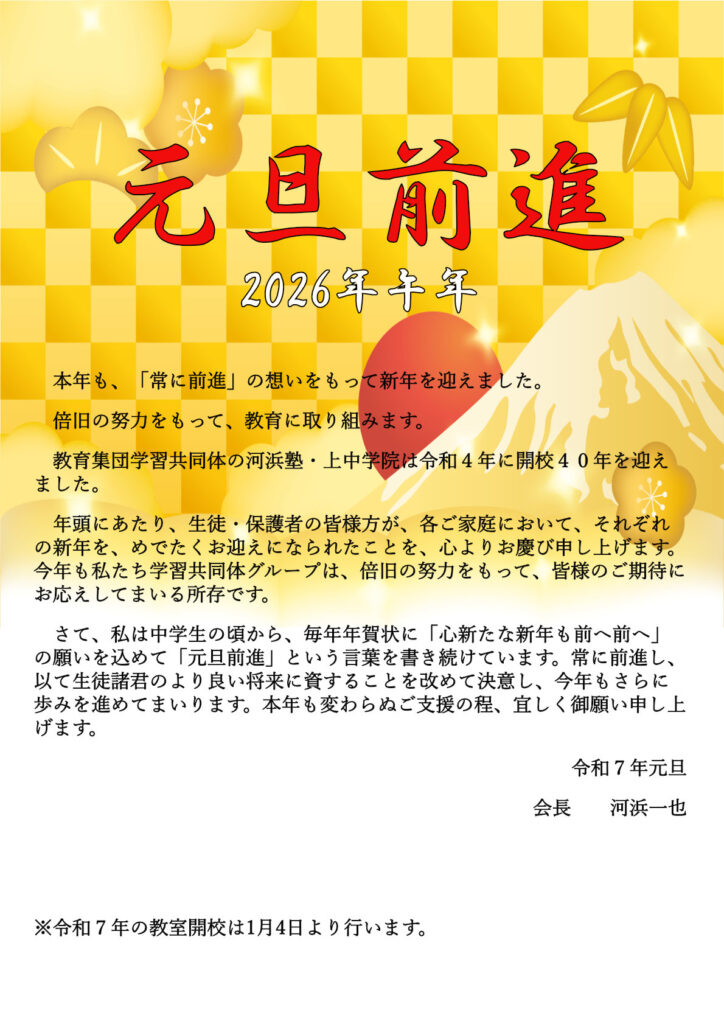 本年も、生徒の皆さんとともに、熱く、力強く、そして確かな歩みで前進してまいりましょう。 2026年も【情熱指導の河浜塾】をどうぞよろしくお願い申し上げます。